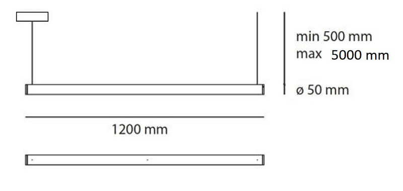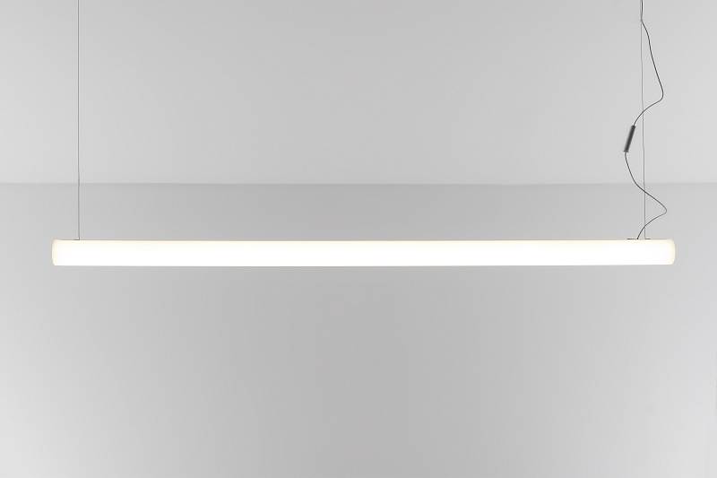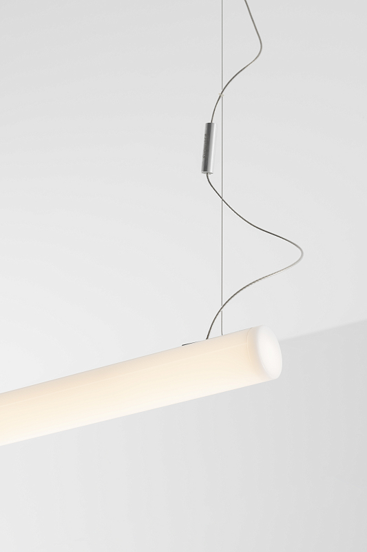 The linear elements are designed in different lengths and are attached to the ceiling by means of wire pendants.