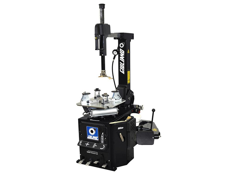 Compact, fully automatic tyre fitting machine with pneumatic swivelling and lockable fitting arm.